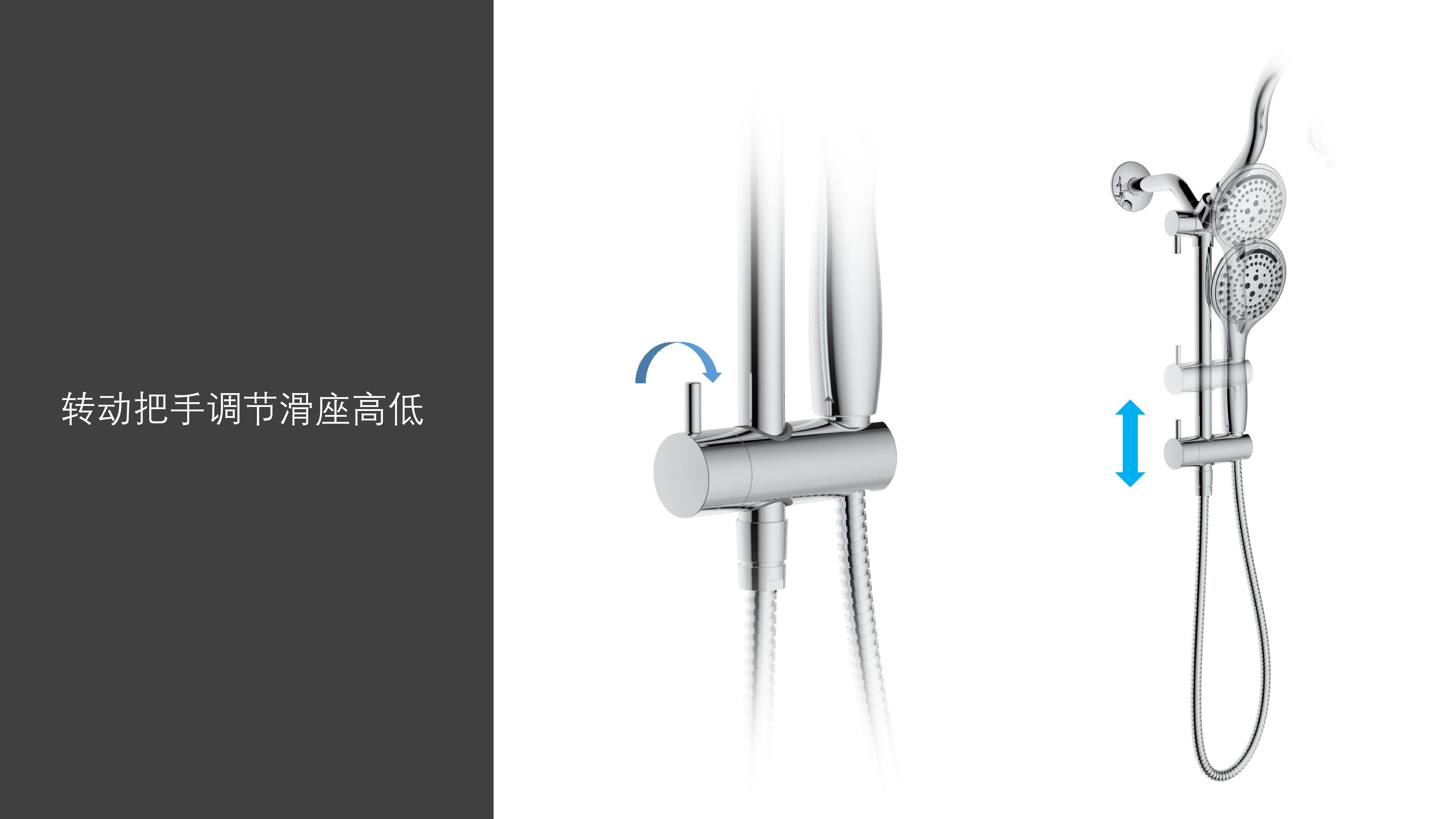 上出水彎管套裝;頂噴內(nèi)置球頭,可實現(xiàn)多角度旋轉(zhuǎn)調(diào)整;把手切換頂噴出水、花灑出水;轉(zhuǎn)動把手調(diào)節(jié)滑座高低